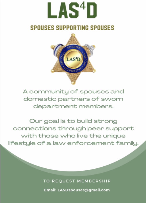 For privacy purposes, members must be married to, or a domestic partner of, a sworn Department member. For those interested in joining or for more information, please contact LAS4D at LASDspouses@gmail.com