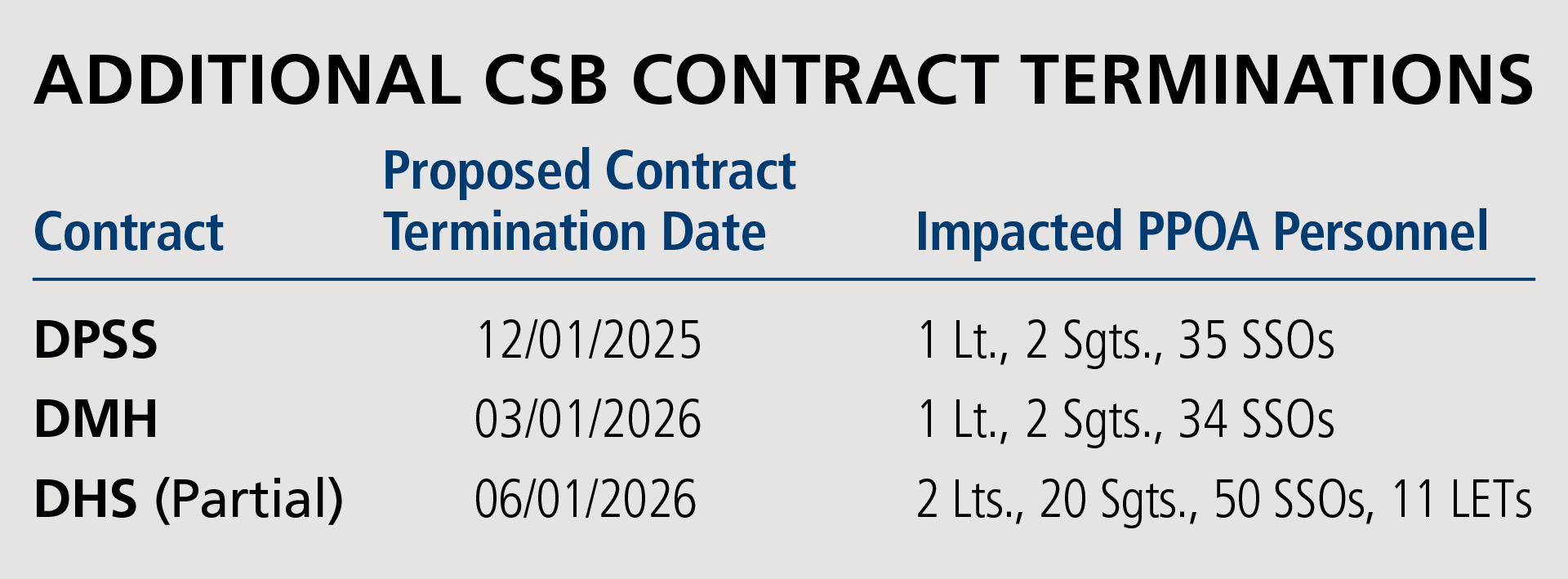 The total number of impacted CSB personnel assigned to the final three proposed contract terminations is four Lieutenants, 24 Sergeants, a staggering 119 SSOs and 11 Law Enforcement Technicians (LETs).