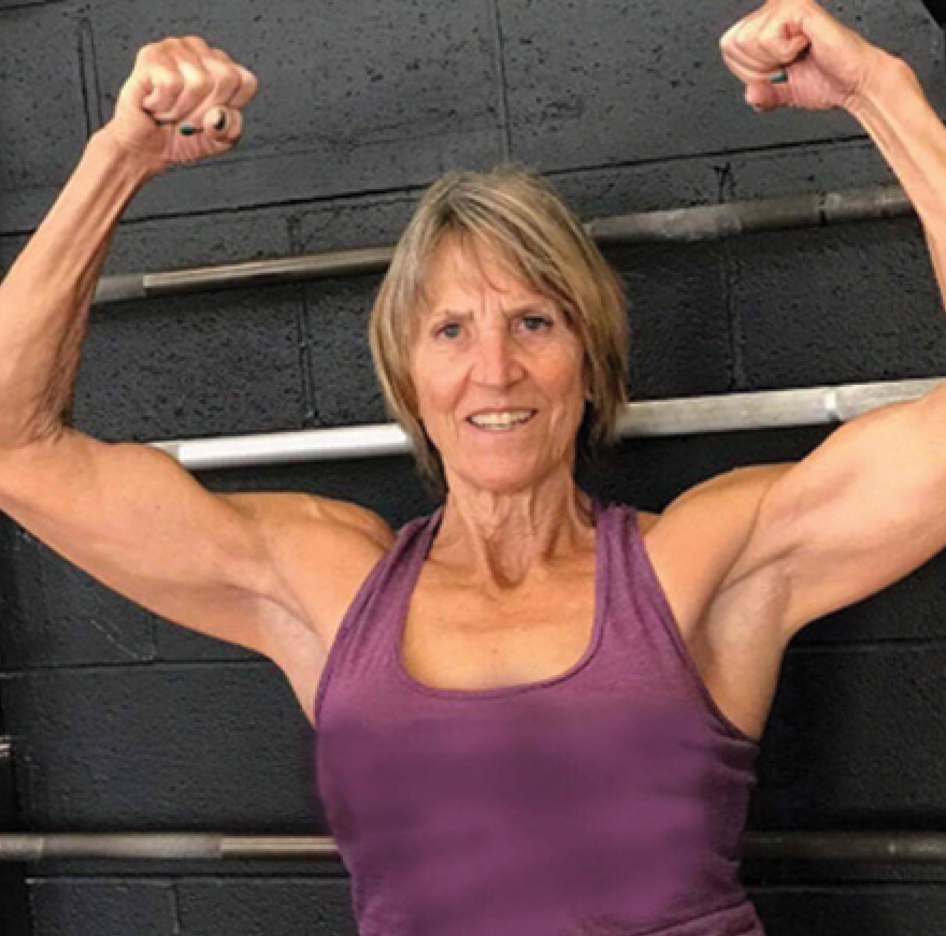 Lynn says she began her journey into CrossFit in 2010 (remember, she retired 16 years prior!) as a new adventure with her daughters. Challenges along the way have never prevented Lynn from pressing forward. “I have been blessed with a sturdy body and have survived a hip replacement and two knee replacements.”