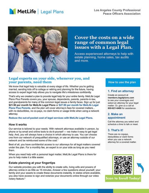 Members concerned about estate planning or identity protection may benefit from enrolling in MetLife’s Legal Plans, available now. MetLife Legal is the largest provider of group legal plans in the United States, established in 1981. Plan attorneys are required to meet rigorous selection criteria and undergo regular reviews to ensure adherence to plan standards.